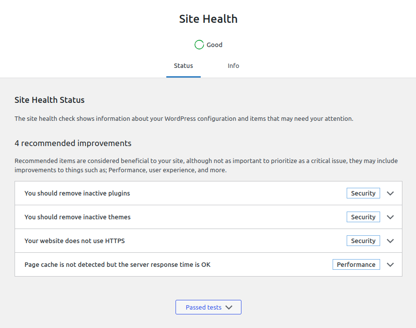 WordPress offers such cool features that you don't think of when you host a static site. Site Health, for example. It provides all kinds of checks that you may not even think of when hosting your website. And I don't want to think about them! I'm hosting this site to write posts, not maintain the back end.